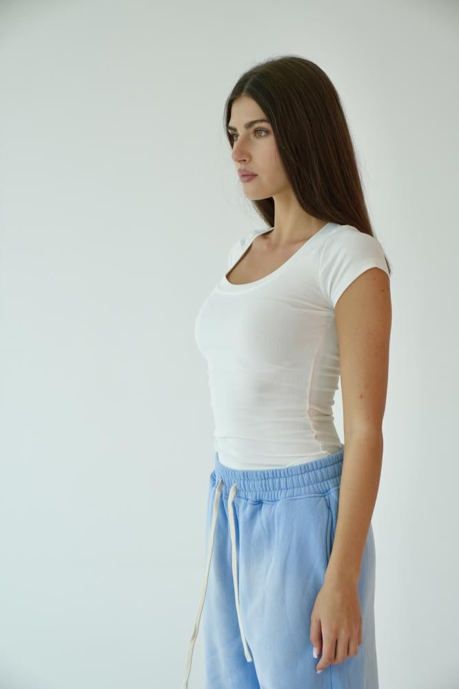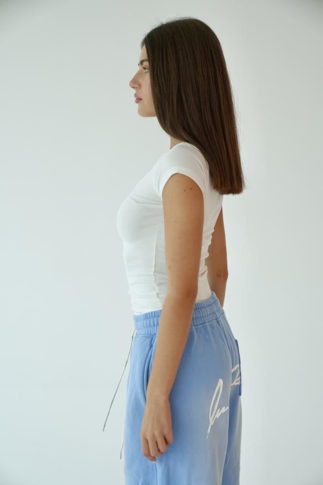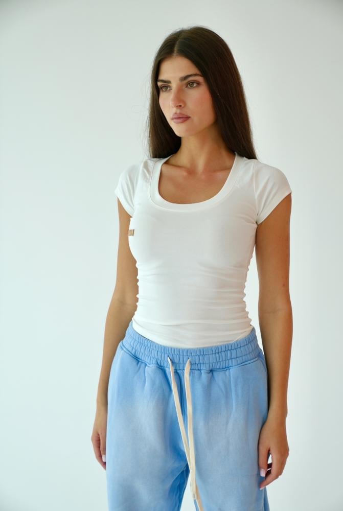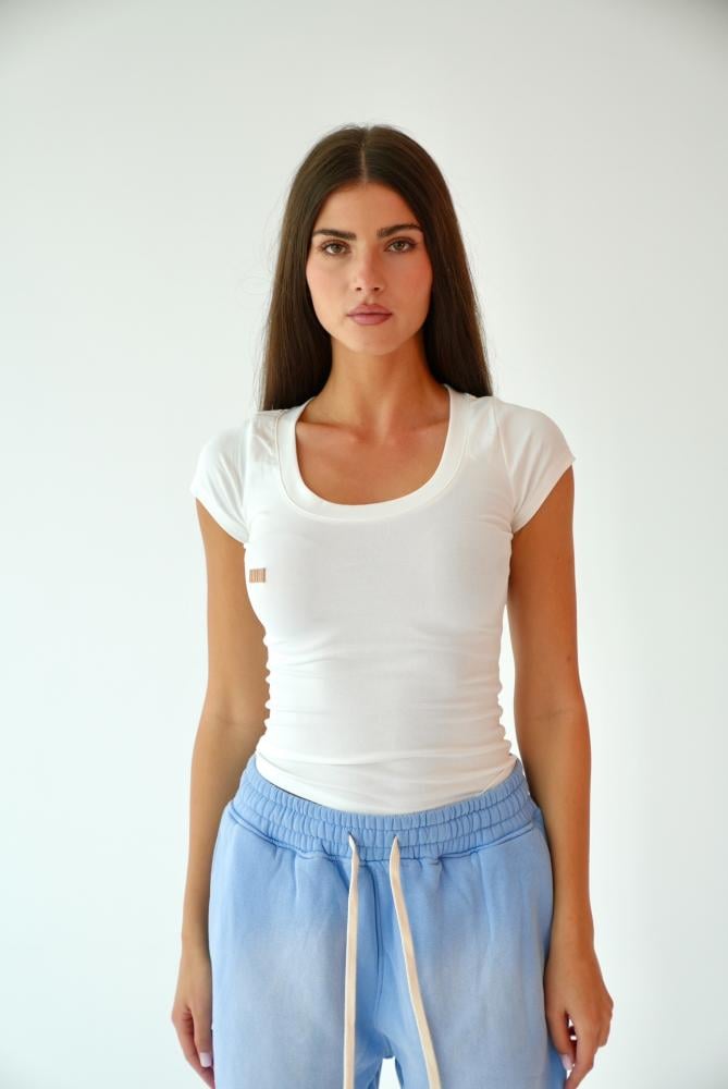 تيشيرت أبيض أنثوي عصري، يتميز بقطعة إكسسوار برونزية بارزة على يمين الصدر منقوش عليها كلمة LUCCHI، كلمسة فخمة وأنيقة تعكس هوية العلامة.