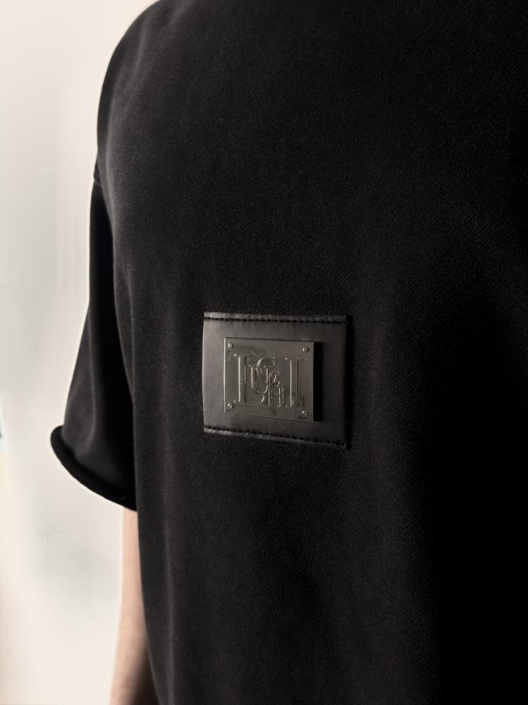 – قطعة فضية لامعة في منتصف التيشيرت، بارز عليها حروف LUCCHI، ومثبتة على جلد أسود فاخر