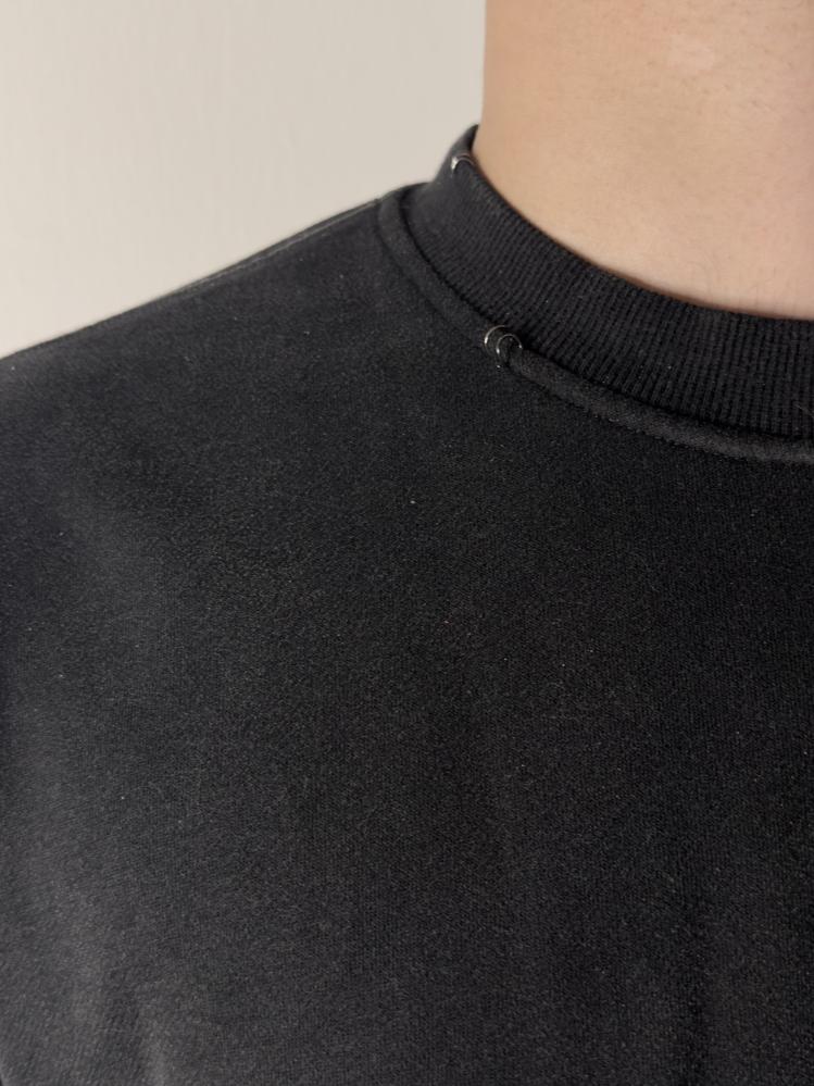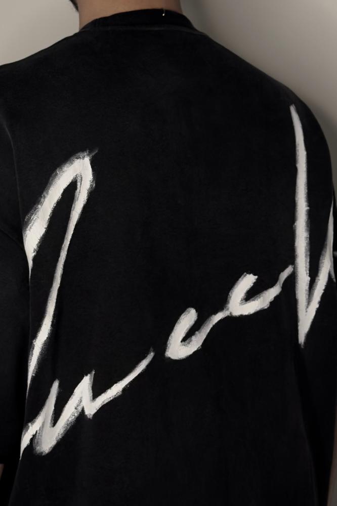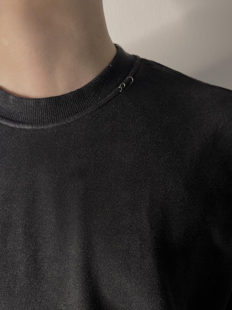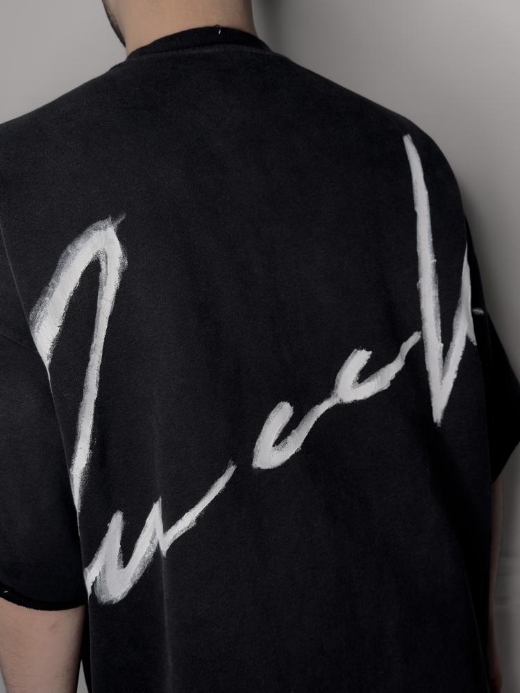 – تأثير spray dye بلون أبيض خفيف على خامة سوداء، لمسة فنية فريدة