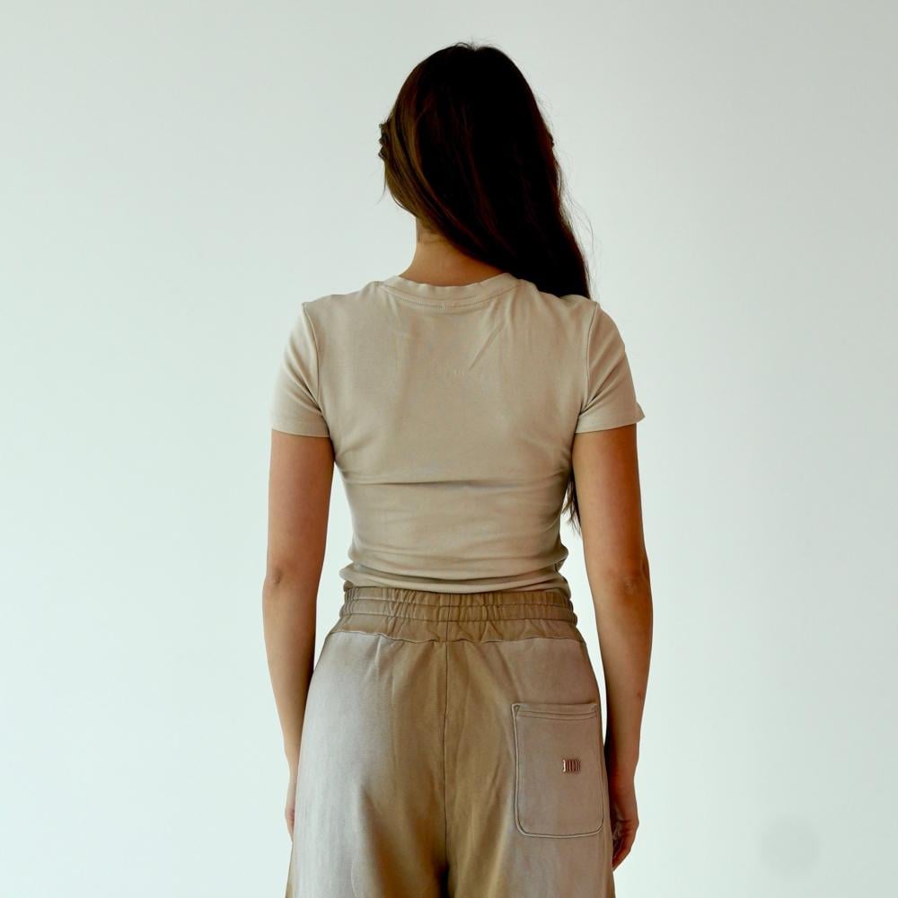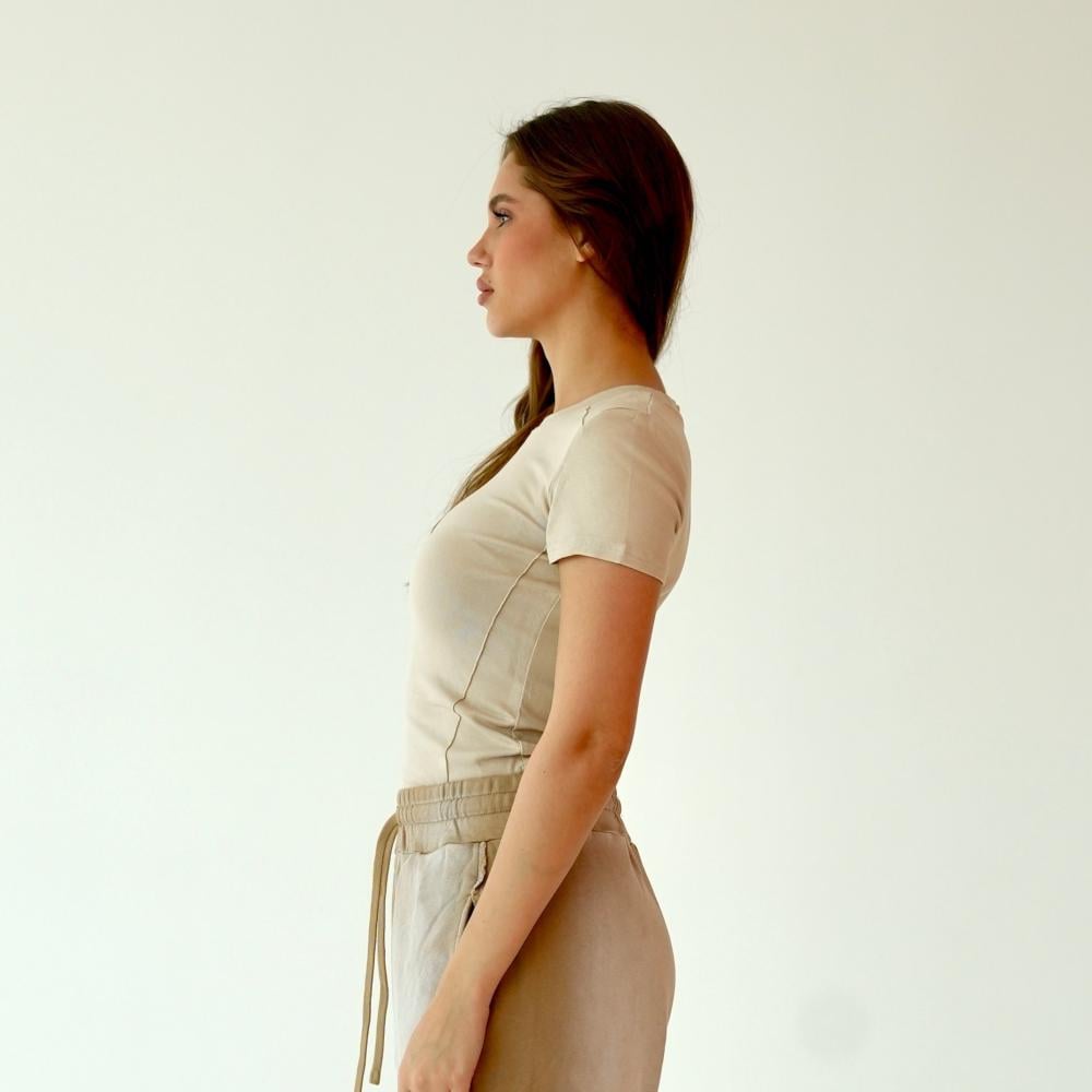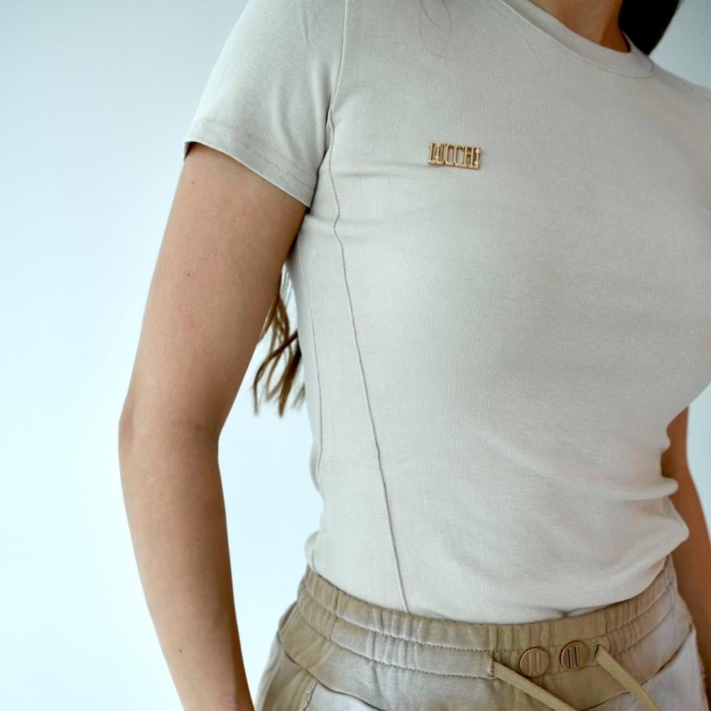 تيشيرت بيج أنثوي عصري، يتميز بقطعة إكسسوار برونزية بارزة على يمين الصدر منقوش عليها كلمة LUCCHI، كلمسة فخمة وأنيقة تعكس هوية العلامة.