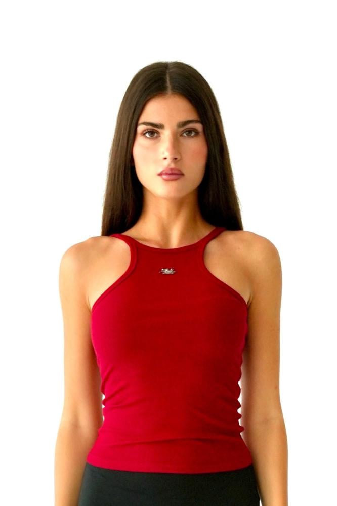 توب بلون كاراميل دافئ، يتميز بقطعة إكسسوار برونزية بارزة في منتصف الصدر منقوش عليها كلمة LUCCHI كلمسة أيقونية.